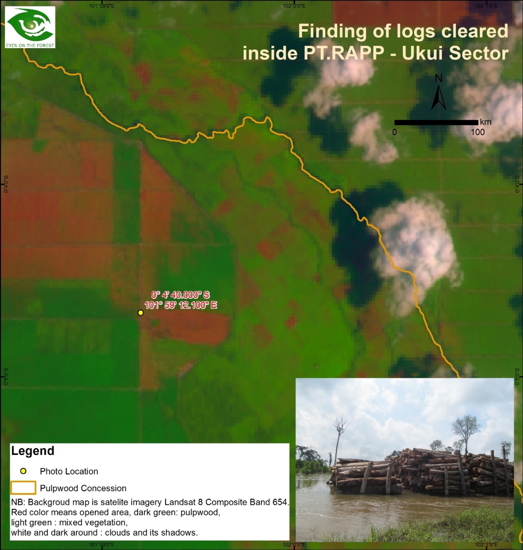 EoF found piles of logs that believed to be cut from natural forest in the green belt of PT RAPP concession in Ukui sector in 31 March 2015 (see Map with photo, below).