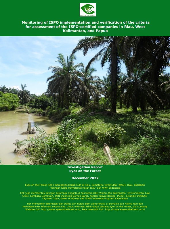 The observation was performed by referring to the standards and indicators prescribed in such sustainable oil palm certification. In general, four aspects were highlighted as the targets of observation against ISPO-Certified companies, namely: Compliance with Spatial Planning, Non-Cultivation inside Forest Estates, Non-Cultivation on Peatlands, and Restoration of Riparian Zones. EoF found that the majority of the holders of ISPO certificates got low grades in terms of their compliance with the aspects of compliance to spatial planning and restoration of riparian zones.